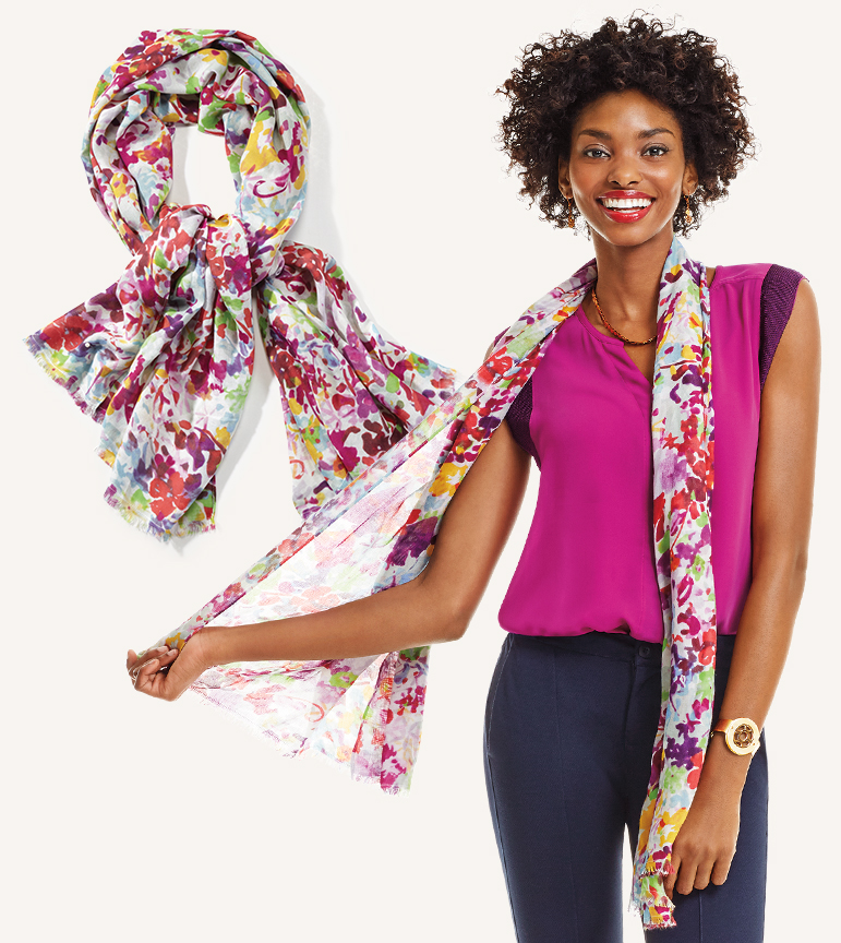 With spring in motion, adding a gorgeous floral item is always a wonderful touch. I’m ALL about accessories because they are the easiest to style! I love that the Flora Scarf can be dressed up or down…but most important, is the perfect office chic accessory for spring. Every time you wear this you will smile!