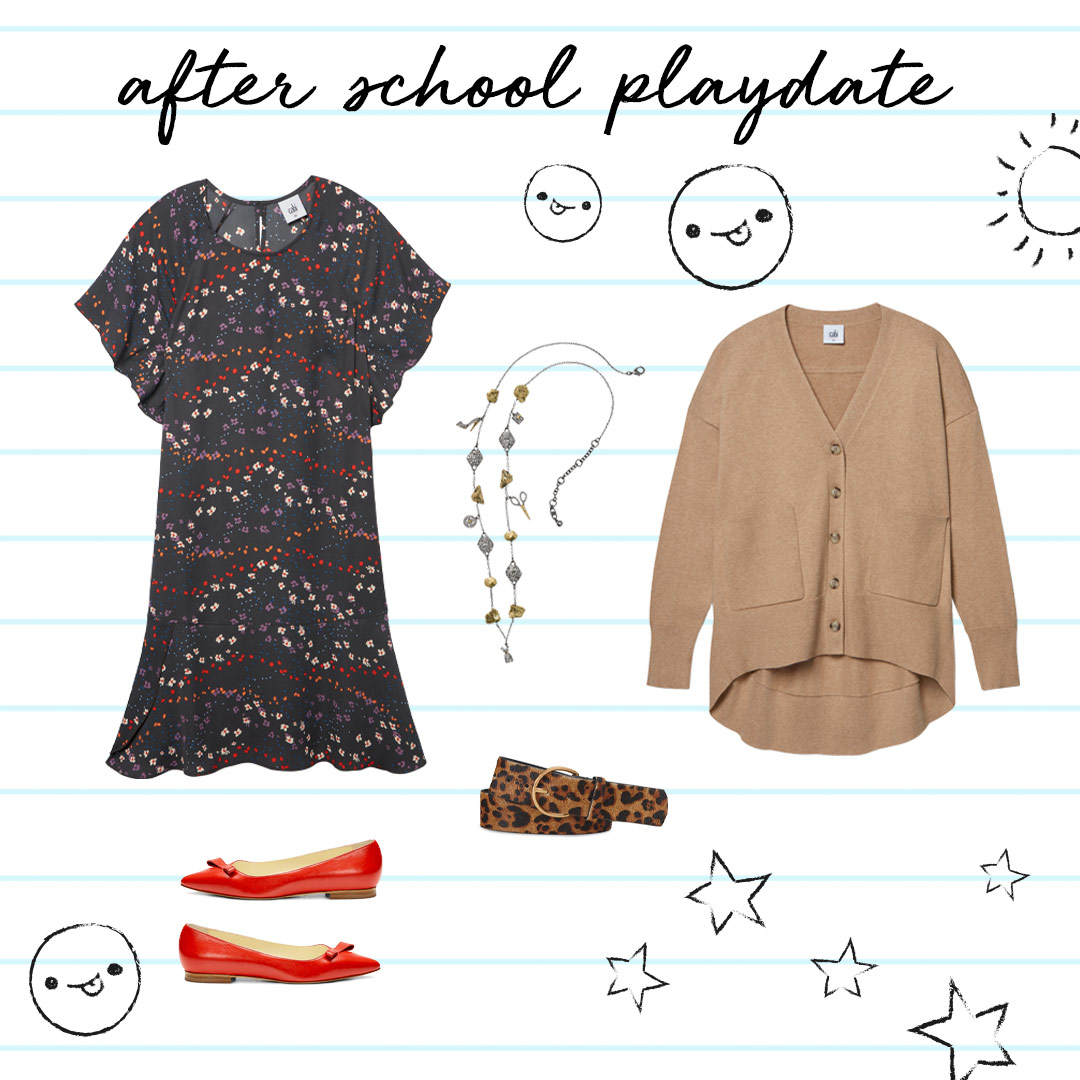 Whether the kids are out playing on the playground or working hard on a group project, you’ll be able to catch up with all the other moms over coffee in this girly, yet casual look. Belt this look at the waist (try it over the cardigan for some added interest), and sport some flats to keep your feet happy in case of a spontaneous game of tag.