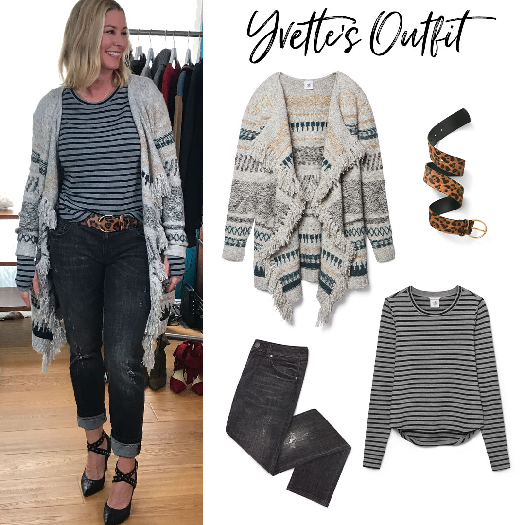 Becky styled Yvette in our Slim Boyfriend jeans paired with a striped, long sleeve tee. She accessorized the look with our Beast Belt and gave the shirt a little front tuck to show off the leopard print. Then, she added the cozy, drapey Shetland Sweater for some added print mixing that still matches the color scheme for a coordinated look. A relaxed jean is the way to go for a working mother of six, and our Slim Boyfriend is just the right amount of slouch and destruction to still look professional at work. The Pivot Fitted Tee is meant for women on the go, as it borders on being an athleisure piece, so Yvette is sure to be comfy all day in this one. Well done, Becky! It’s almost like styling is her job or something…