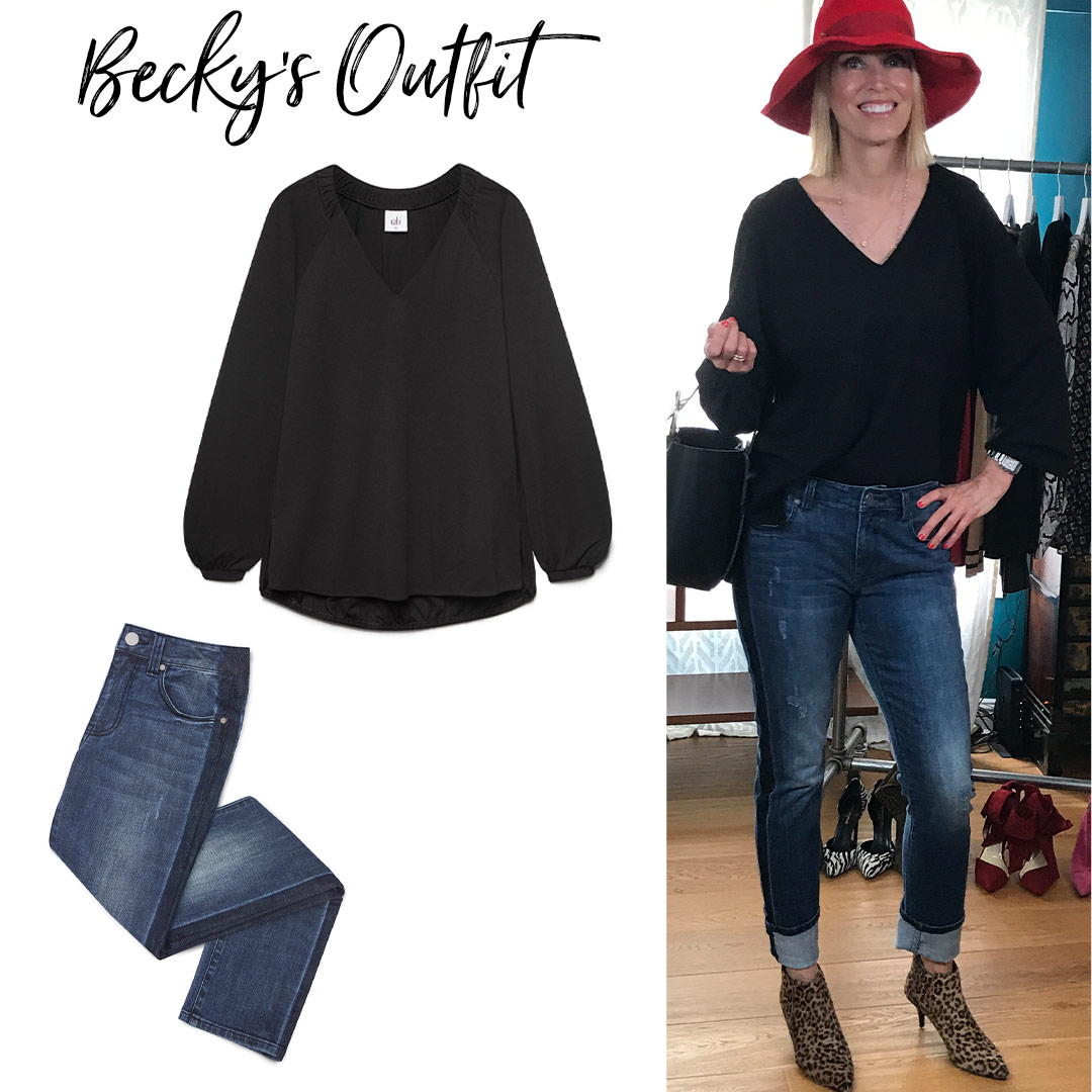 Yvette went a simple, yet striking route with her outfit choice for Becky. She chose the Tuxedo High Straight jeans with the solid black Swanky Tee. She styled with a front tuck to create a longer hemline at the back. For this sleek, classy look, Yvette added some accent pieces like a wide brim red hat and cheetah booties for a little extra pop. This look is perfect for Becky because it’s well put together with an emphasis on the smaller details. Working in fashion means your personal style is always on display, and you have to remain at the forefront of the industry—keeping up to date with the new fads, but sometimes you just want to lay low and go with an understated outfit like this one. You can’t go wrong with a pair of jeans and a black top if you add some unique accessories into the mix. Becky looks elegant, professional, comfortable, and confident. Yvette nailed it with this one.