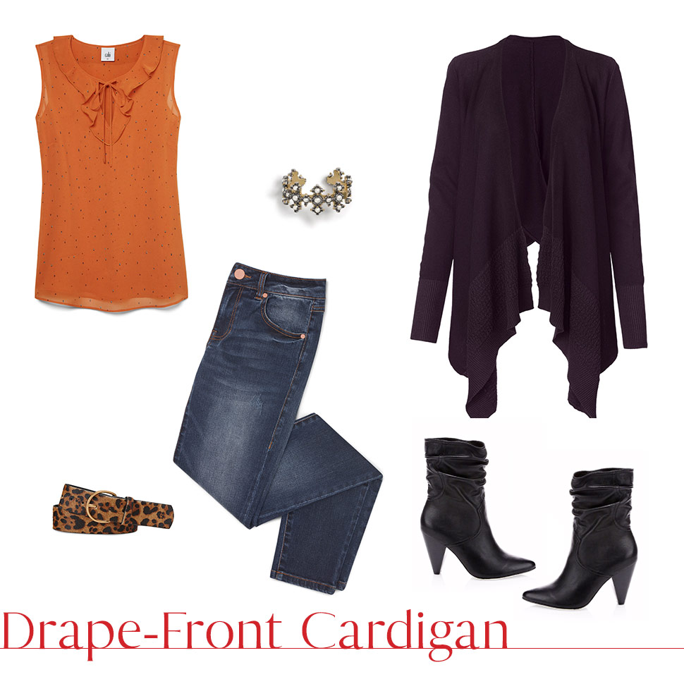 Featured Items: Drape-Front Cardigan, Sprinkle Top, Original Wash Skinny, Beast Belt, Tudor Cuff, Ankle Boots
