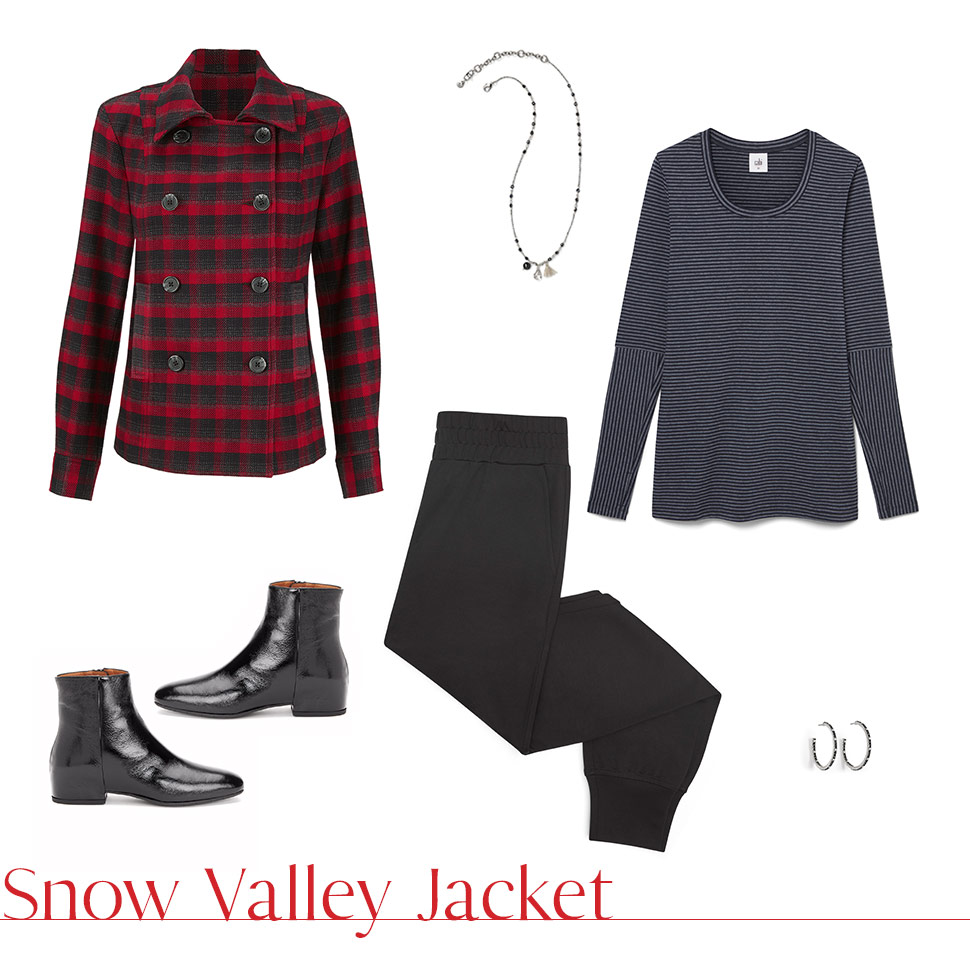 Try a long sleeve tee with thumb holes under the Snow Valley Jacket for a peek of contrasting stripes at the wrist. A classic jogger is a comfy bottom that won’t hold you back. Accessorize with a black-accented necklace.