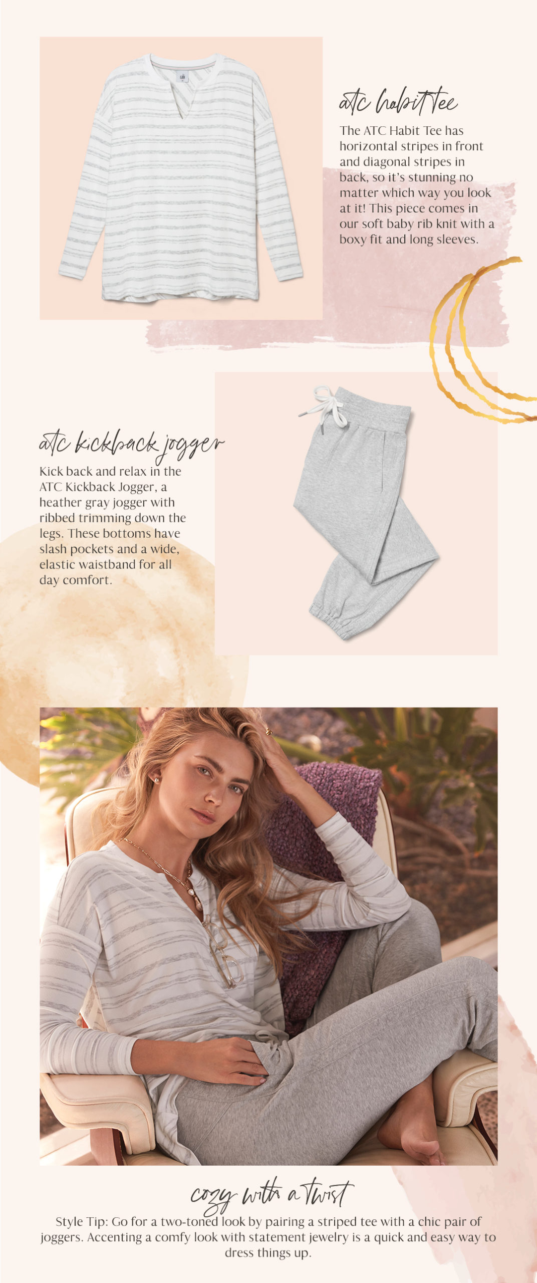 This past year we all became connoisseurs of coziness, learning to reach for comfy knits and slouchy fits to curl up in while staying safe at home. The Spring 2021 Collection is here to challenge what you thought you knew about athleisure clothing. Yes, the styles are still cozy as ever, but we’re encouraging you to branch out of your comfort zone…without sacrificing comfort! Add some structure and color to your look by styling stretchy joggers with a tailored jacket or add some dazzling jewelry to a modern sweatsuit. Just because you’re staying home doesn’t mean you can’t explore your style.