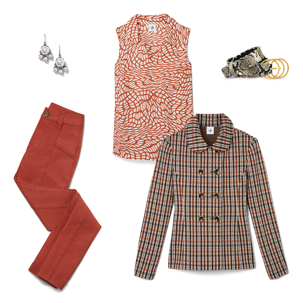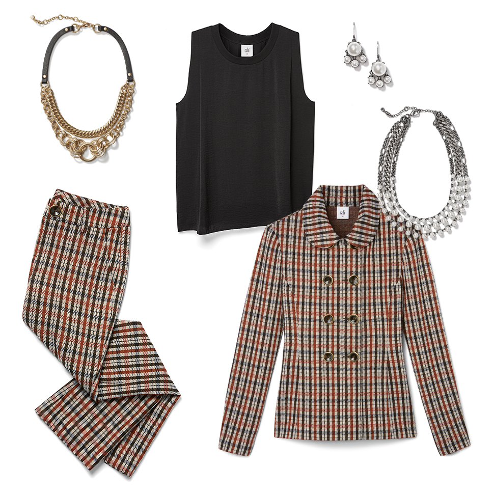 Style the matching Jazzy Jacket and Kick Flare bottoms for a suited set. Dress up this contemporary plaid suit by styling a silky black blouse underneath.