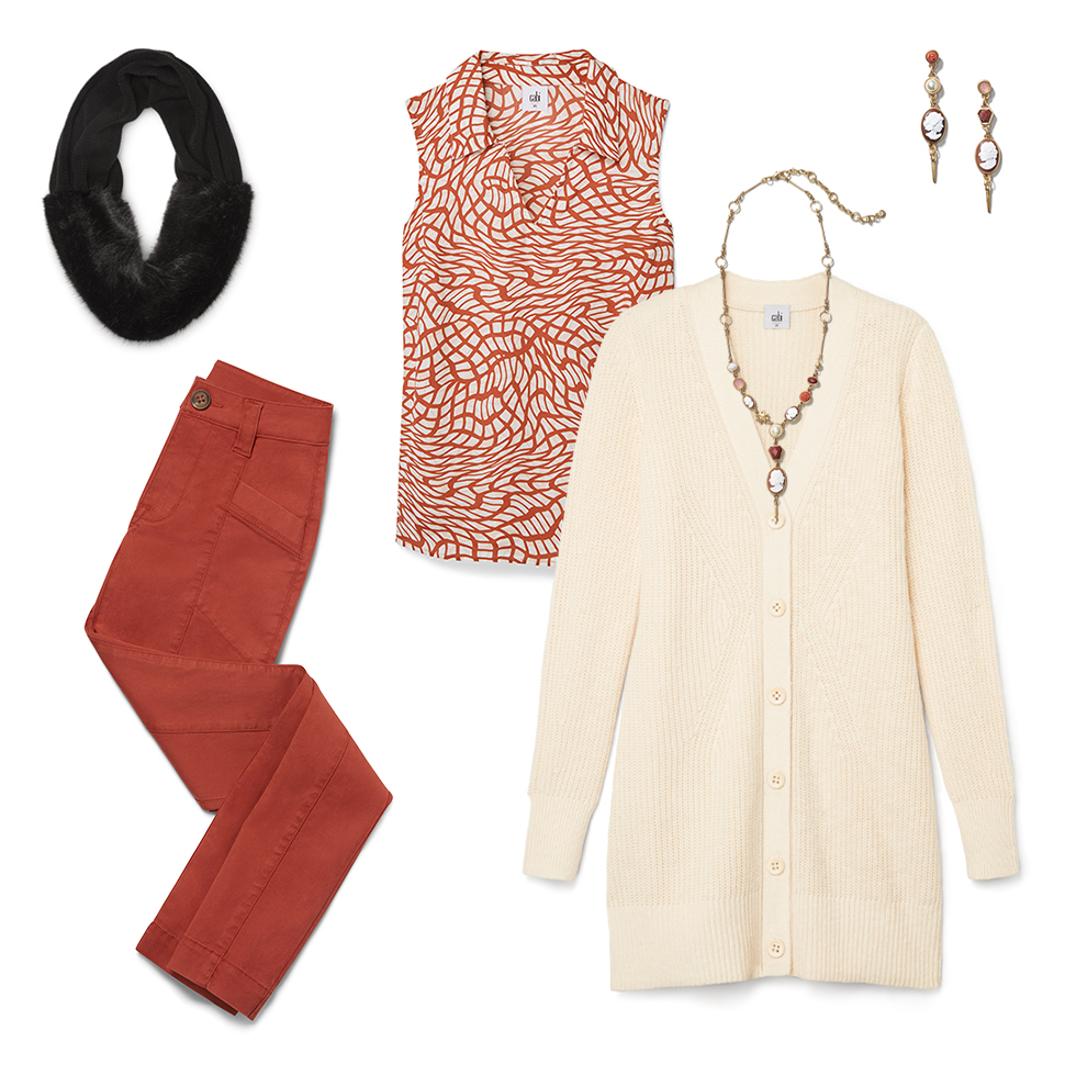 Try a monotonal look that pairs the patterned Twirl Top back to The Explorer bottoms of the same hue. Temper this fiery palette with the ivory Book Club Cardigan.