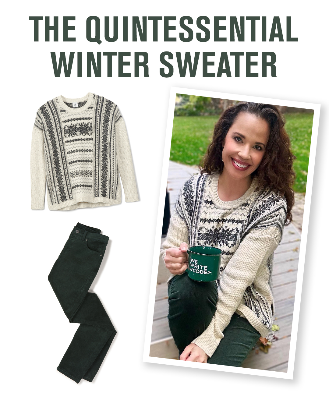 When you think of winter sweaters, the Chalet Pullover should be the image that comes to mind. A classic snowflake stitch pattern across an ivory base makes this one of our coziest designs to date.