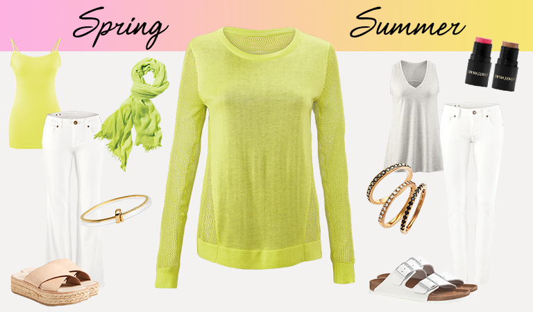 SPRING: Split Back Pullover, Simple Cami (Lemon Lime), White Wide Leg Jean, Pop Scarf, DV by Dolce Vita Shoes, Alexis Bittar Bangle