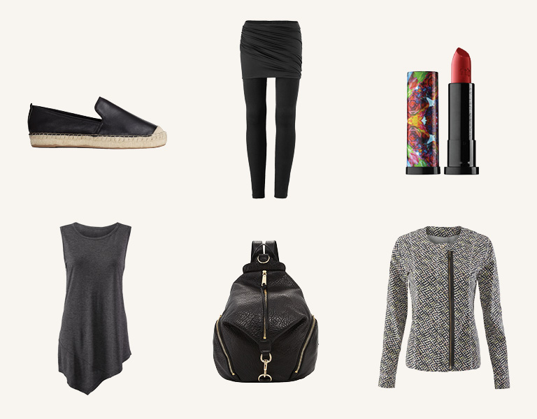 H&M Leather Espadrilles, Rebecca Minkoff Leather Backpack, Urban Decay “Alice Through the Looking Glass” Lipstick, Mesh M’Leggings, Asymmetrical Tank (Charcoal), Cliffside Jacket