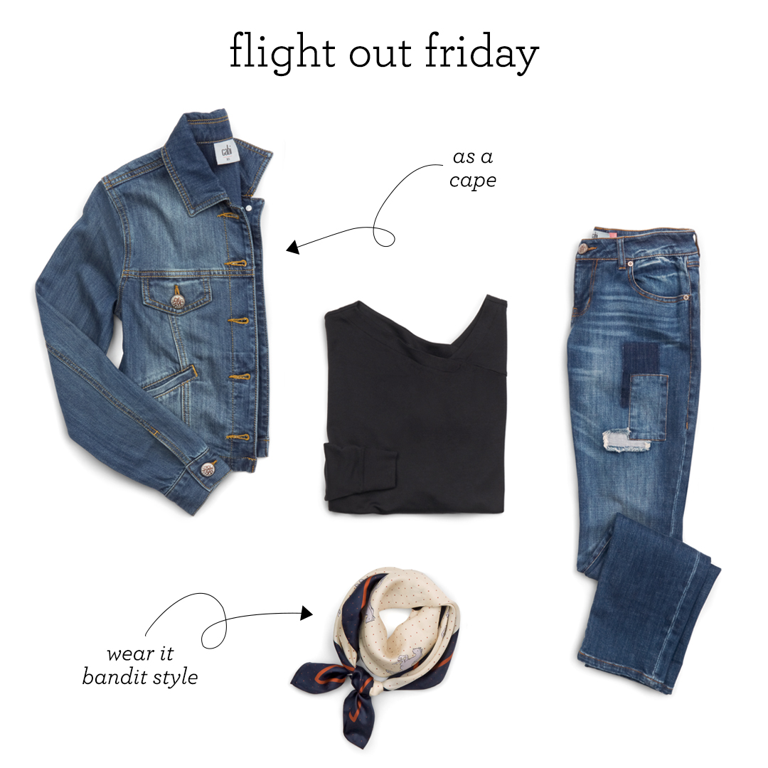 Travel in comfort and style with a cozy, yet oh-so-chic sweatshirt and a jean jacket for a cool jet-setter look.