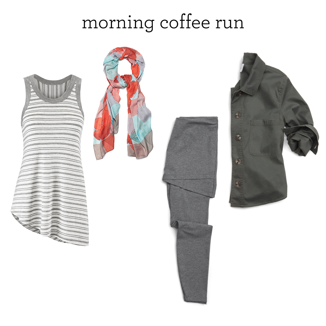 When it’s still a little chilly in the early morning, warm up with a cup of coffee, a printed scarf, and a light boyish jacket.