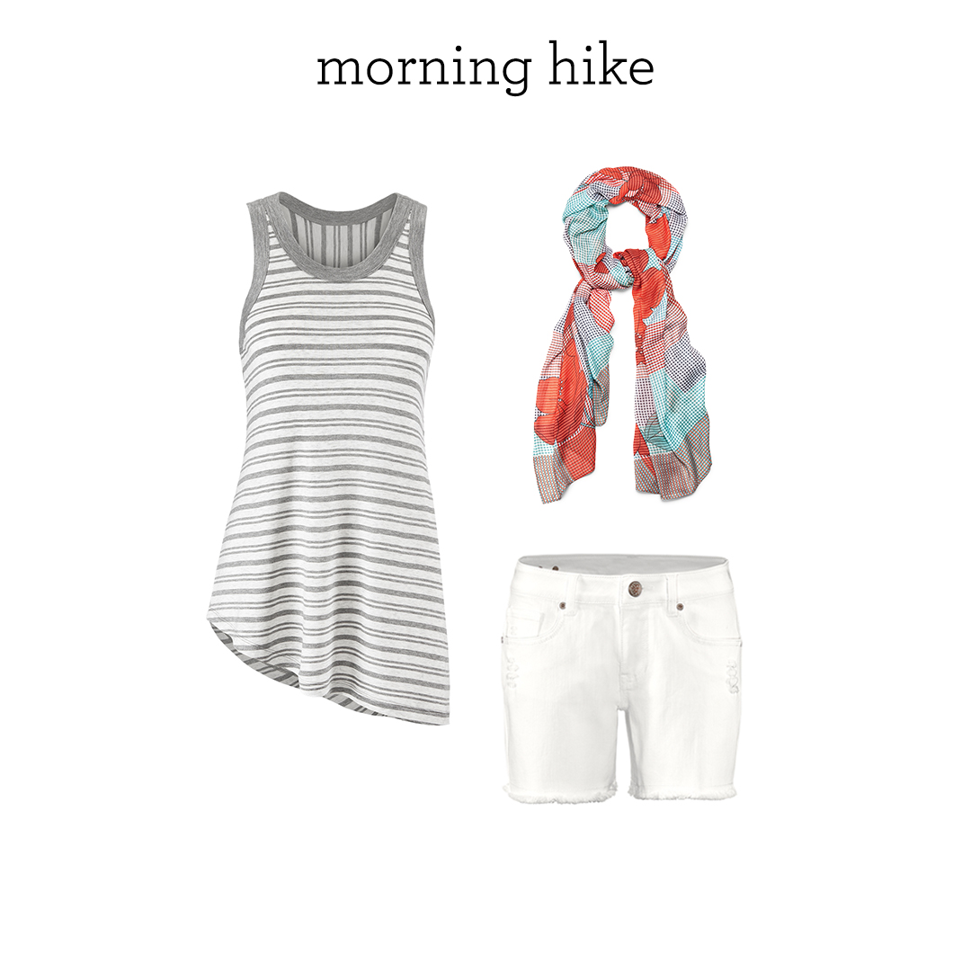 Enjoy the sunrise during a morning hike with this print-mixing look. The Gingham Scarf provides a light layer that is easy to take off when it starts to warm up.