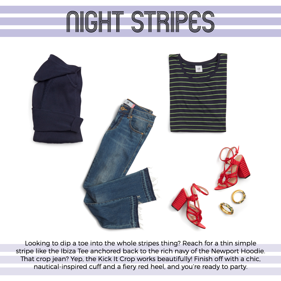 You can double your lines in a single striped outfit by matching horizontal to vertical, add pattern (think flowers), and frills (ruffles!). You can certainly use a pop of color to brighten up a neutral palette—yes, solids have their place too. If it all feels a bit overwhelming, don’t worry. We just so happen to know the perfect striped outfit spokeswoman, cabi Fashion Director Becky Jantzen, to help explain things! We captured all her best tips and tricks in this handy little video you’ll want to refer back to all summer long.