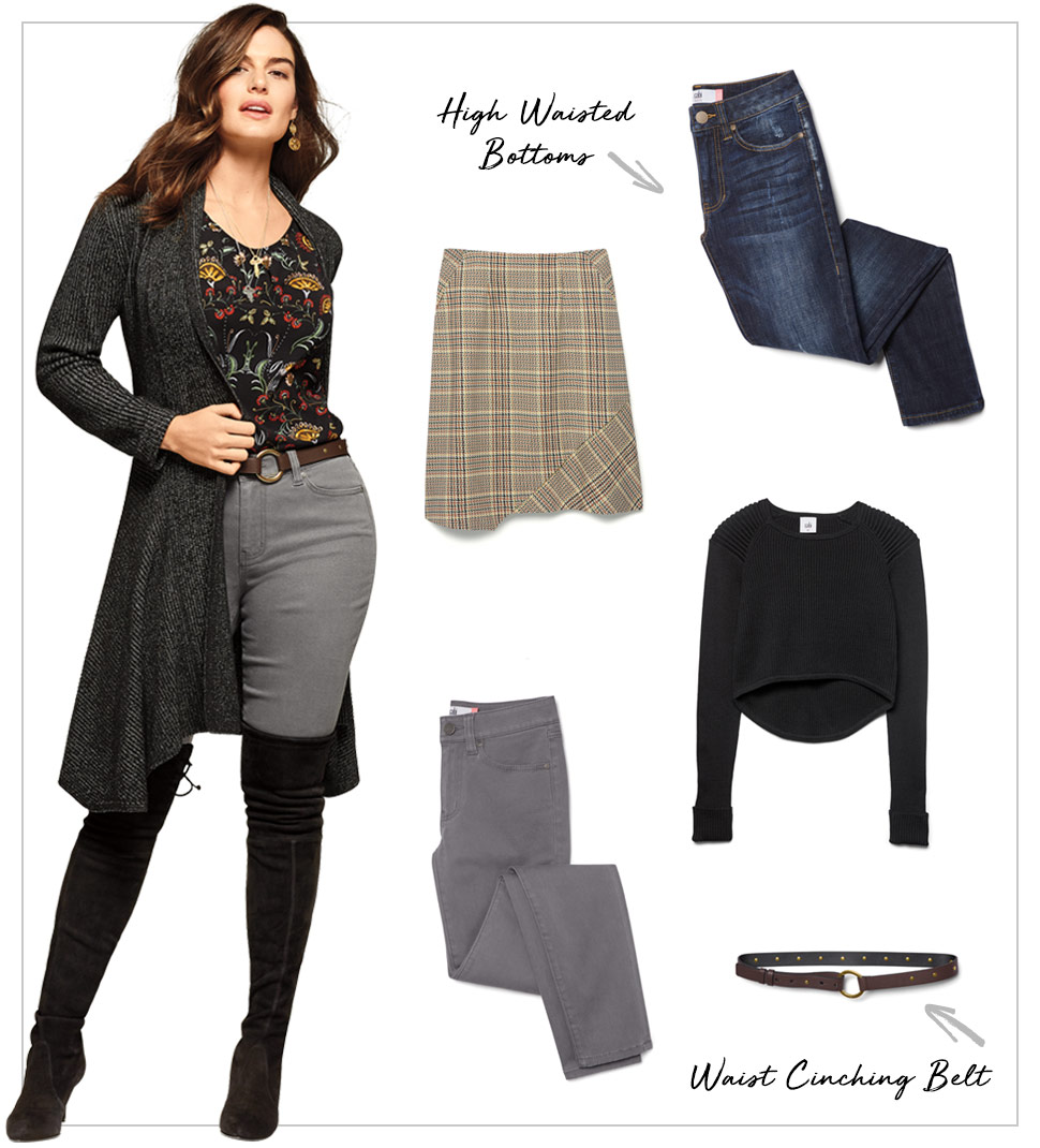 Show off with high-waisted pieces that nip in at the midsection and work overtime to define your hips and bust. Think high-rise jeans and skinnies and pencil skirts. And always have a fabulous belt on hand for cinching it together!