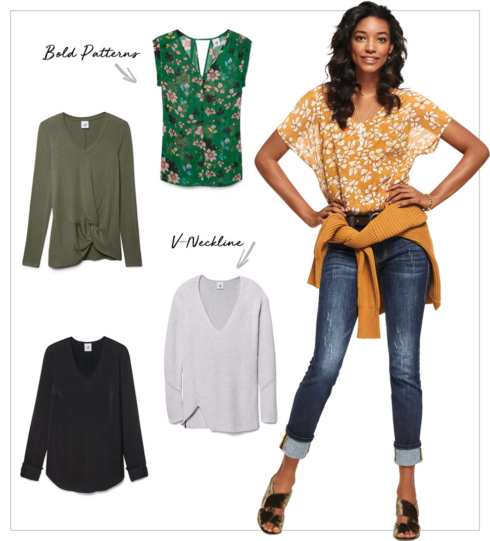 Shimmy into something with lovely neckline detail, like a V-neck tee, pullover, or gauzy blouse, then reach for outerwear that looks great unzipped for a peekaboo twist. When in doubt, always reach for bold colors and patterns up top to draw attention.