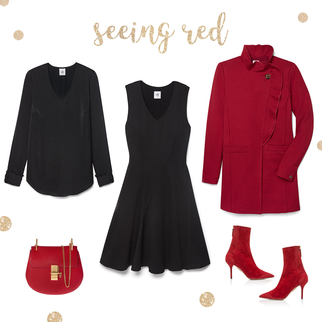 Make primary hues pop against an all-black ensemble by adding a vibrant red statement coat like the Celebration Jacket over the simple perfection of the Performance Dress and Classic Blouse. When the jacket comes off, keep your colors popping with a fiery bootie to match!