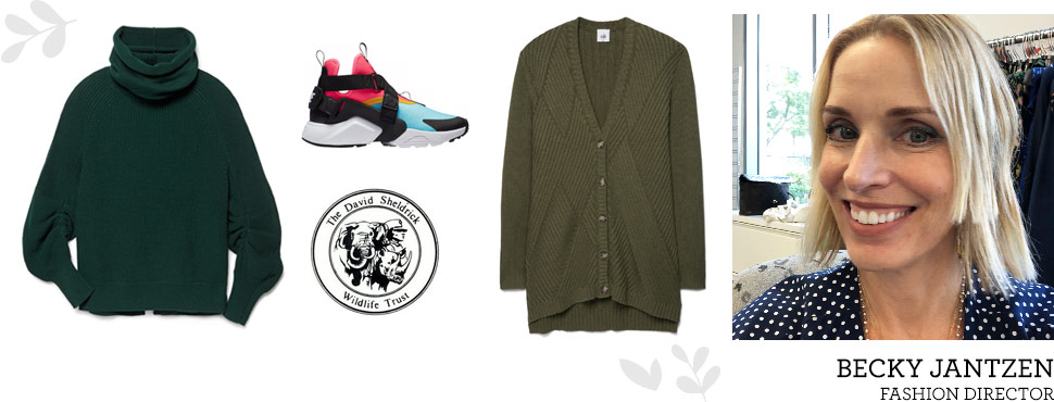 Featured Items: Cowl Pullover, Aerial Cardigan, Nike Air Huarache Shoes, a Donation to Sheldrick Wildlife Trust