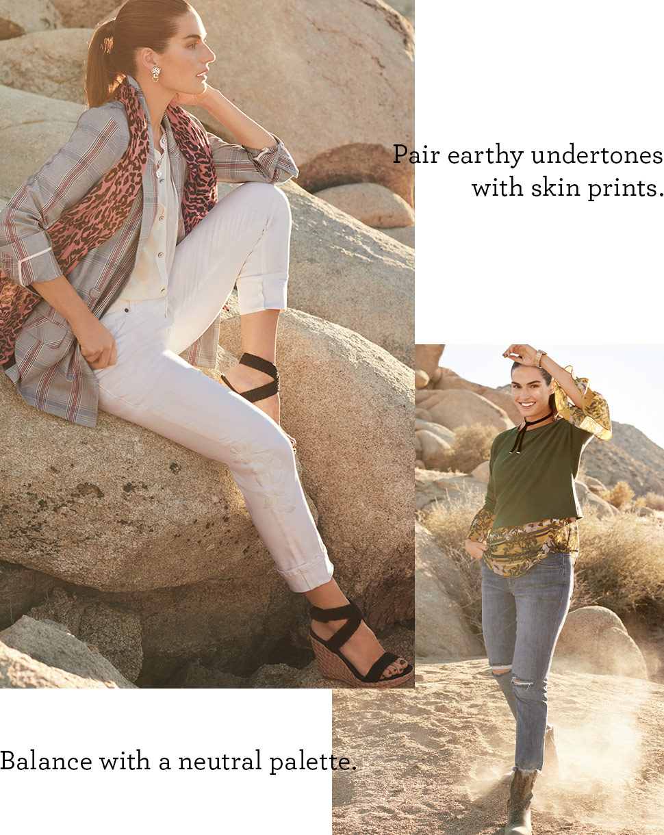 This trend is right at the crossroads where the savannah meets the city. A more neutral palette plays on the colors of the desert. Shades of olive and beige serve as a strong backdrop to your outfit. We’re looking at utilitarian outerwear layered over tailored pieces such as a slim-fit skirt or white skinny jeans for a contrasting silhouette. And let’s not forget about accessories—finish off your earthy look with an elegant hat and skin print details.