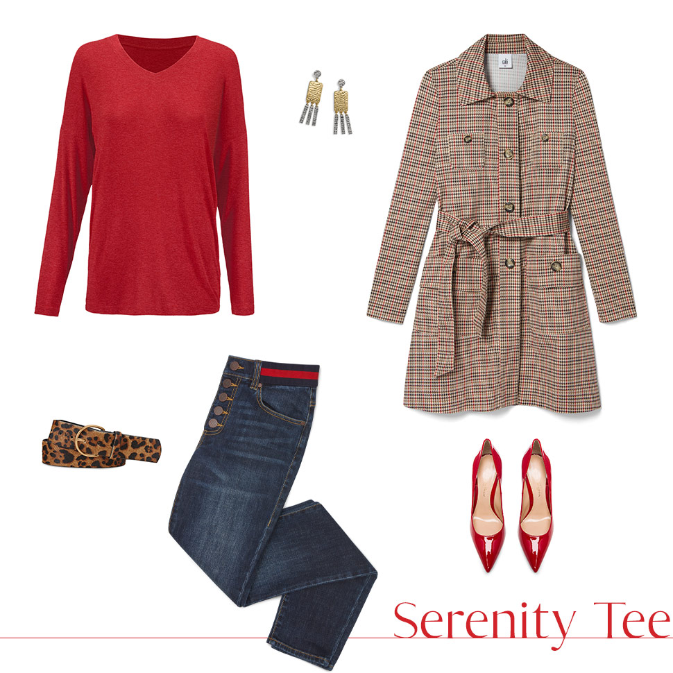 A casual T-shirt like our Serenity Tee can be dressed up by pairing with a printed trench jacket. Add some un-distressed denim for a clean look, and accessorize with a fierce red pump and an animal-print belt for some intriguing pattern mixing.