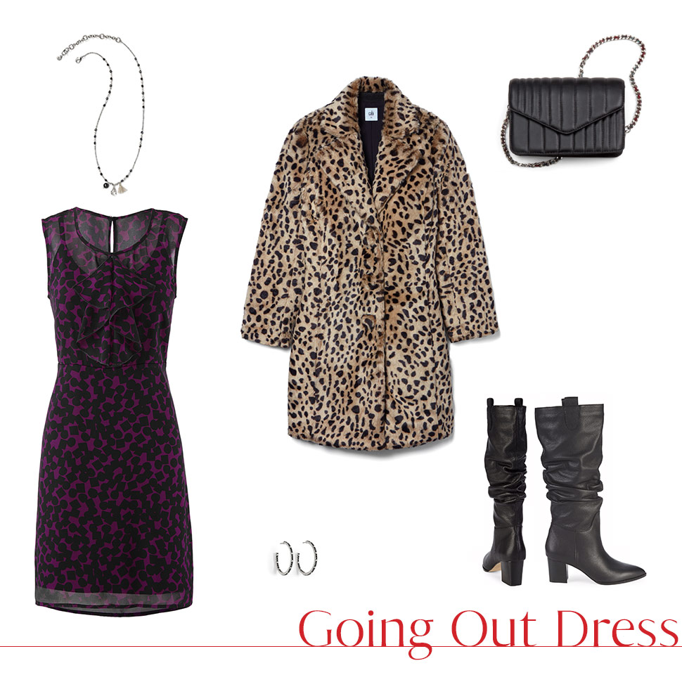 It’s all in the name when it comes to our Going Out Dress. For your next night out, try this geo-patterned dress with the Josephine Coat for an irresistible blend of prints. Add tights and a slouchy leather knee-high boot if it’s chilly.