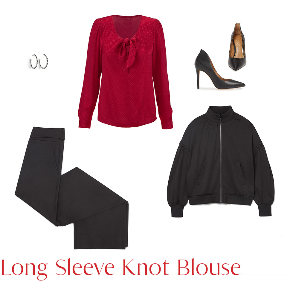 Featured Items: Long Sleeve Knot Blouse, Chance Bomber, Chance Wide Leg, Jet Hoops, Leopard Pumps
