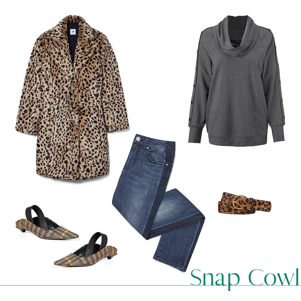 Dreaming of effortless style? Snap out of it…and snap into our Snap Cowl! Think of this pullover as a step up from your average sweatshirt. Try pairing with printed sling-back shoes to match the Josephine Coat.