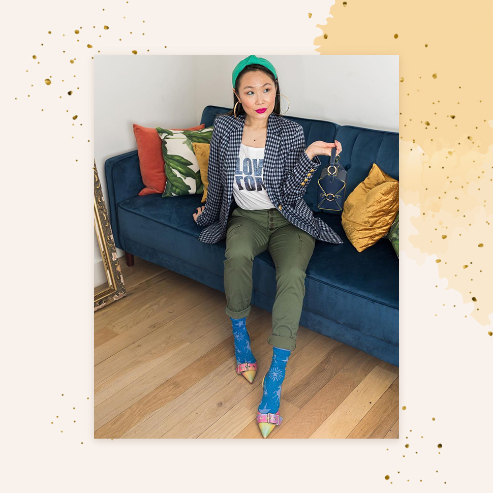 Mary Gui is unafraid to mesh vintage styles with contemporary designs and can always be caught mixing her colors and patterns. In her words, she’s “chronically overdressed” but hey, every day is a celebration, so why not dress up? She also has her own fashion-forward sock brand. Socks and sandals anyone?