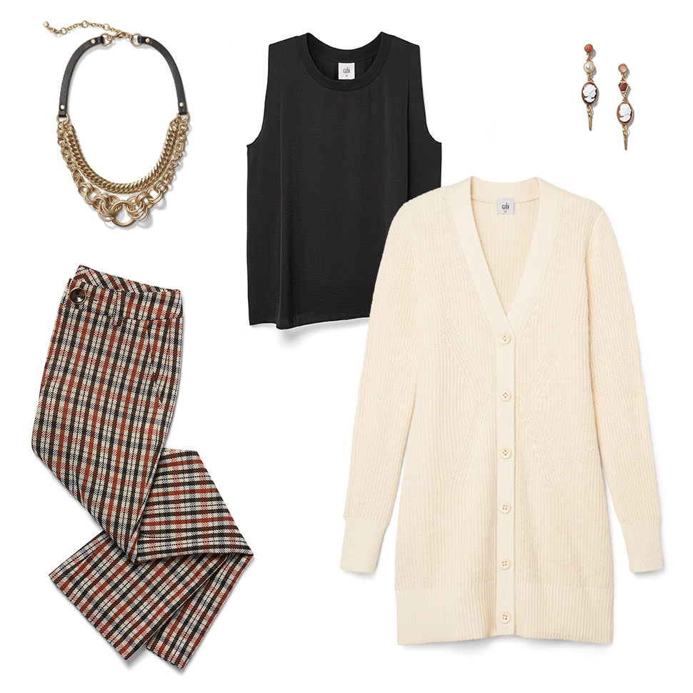 Style the matching Jazzy Jacket and Kick Flare bottoms for a suited set. Dress up this contemporary plaid suit by styling a silky black blouse underneath.