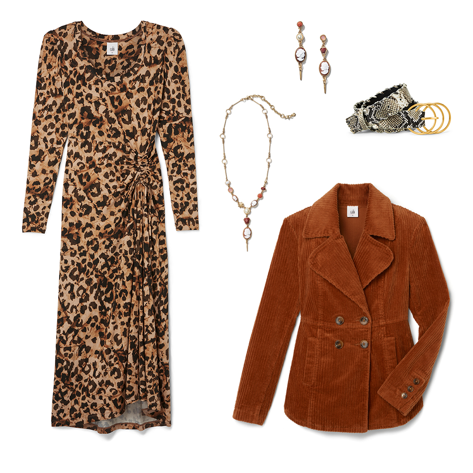 Add definition to your outfit and flaunt your figure by belting the Professor Peacoat at the waist over the Selma Dress. The burnt orange hue of the coat contrasts the leopard print of the dress beautifully!