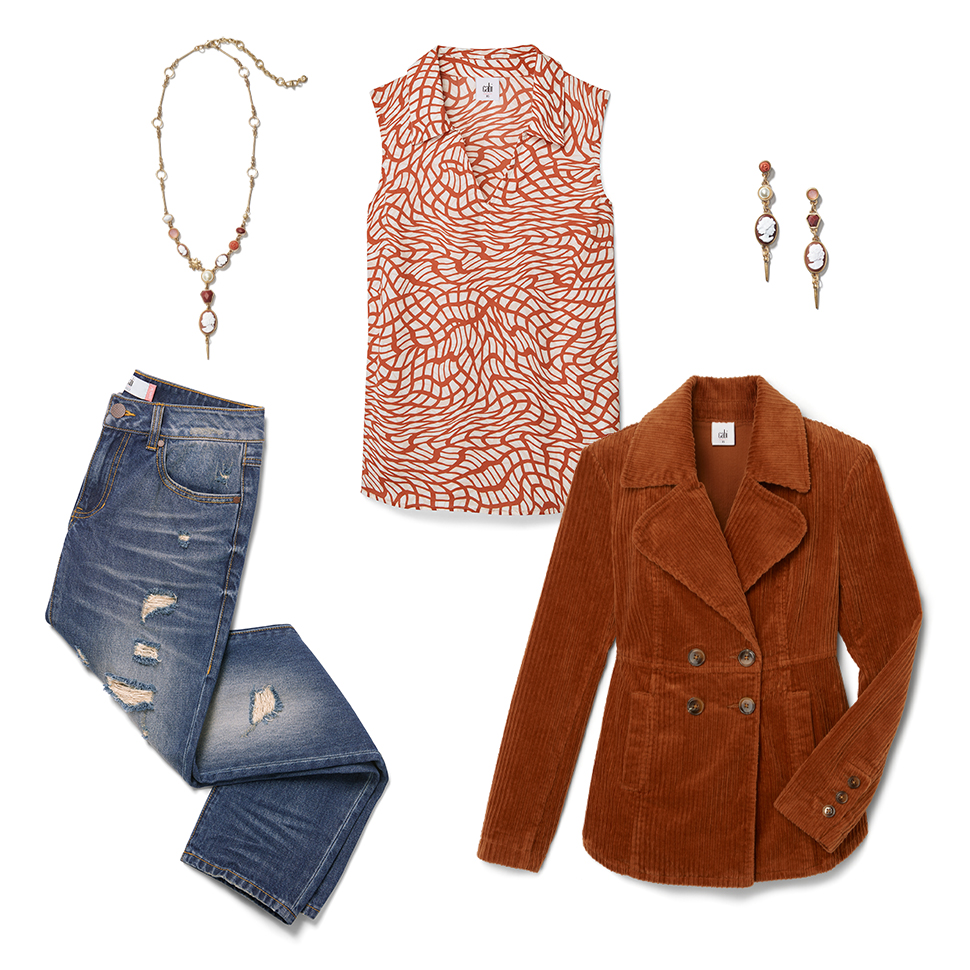 Here’s an expert tip: mix your textures, but match your palettes. It’s not as hard as it sounds! The printed Twirl Top lends itself to being styled with the corduroy Professor Peacoat. Balance your palette by pairing back to denim.