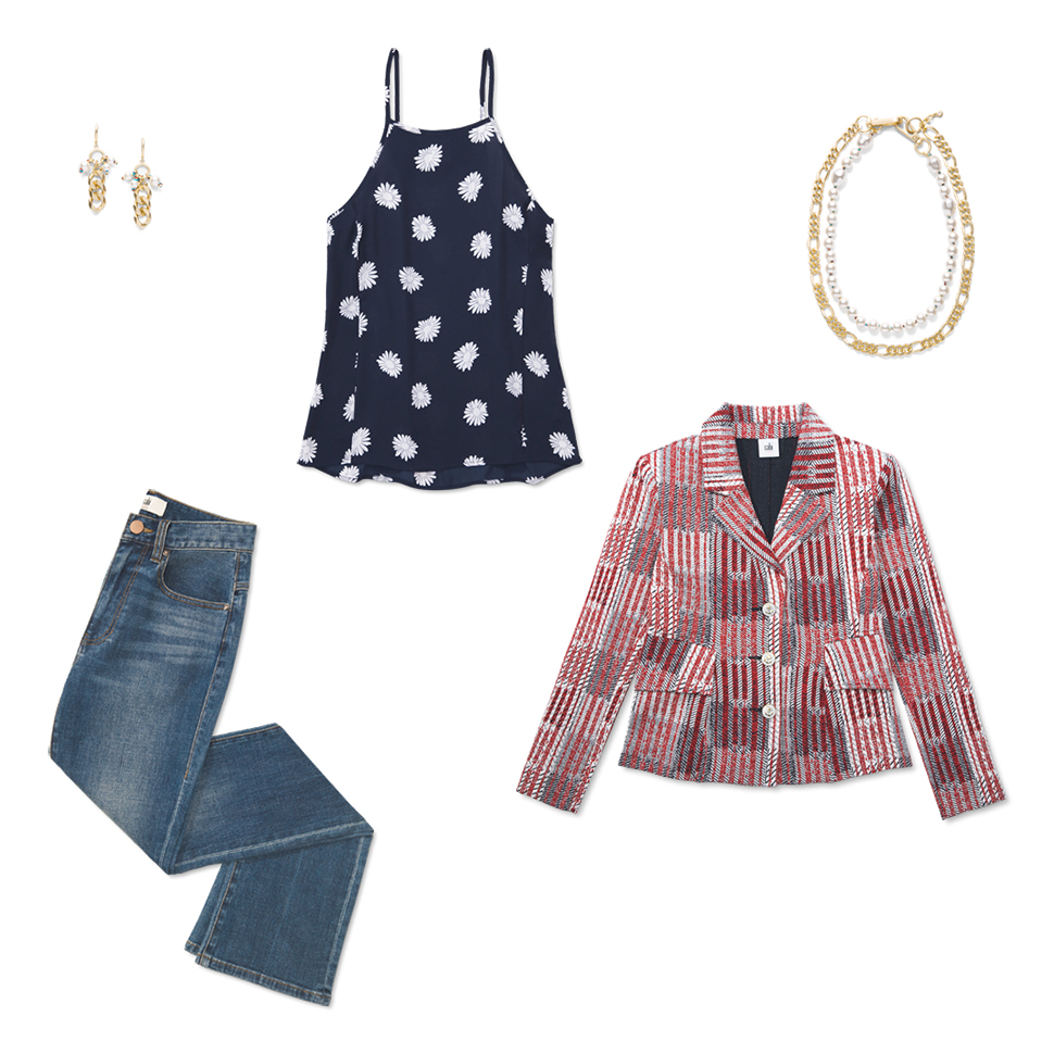 Here’s how to put a fresh twist on a patriotic palette: reach for the vintage-inspired Patchwork Blazer, then tie it back to a midnight navy and white floral blouse and classic blue jeans.