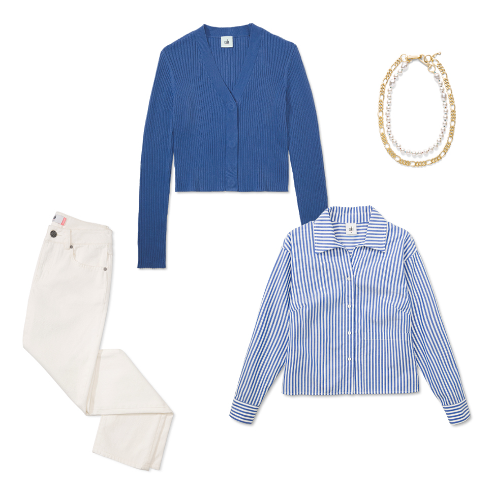 Style the periwinkle Slim Rib Cardigan back to the blue and white striped Prep School Shirt for expert-level coordination. The blues never felt so good!