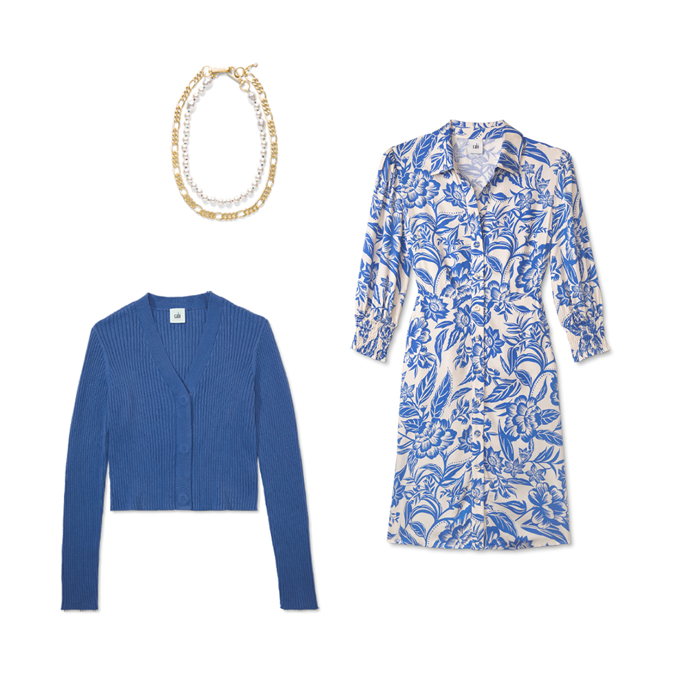Set your away message and slip into the blue and white floral Athena Dress. For cooler nights, add on the Slim Rib Cardigan to add dimension to this quick, easy, irresistible look!