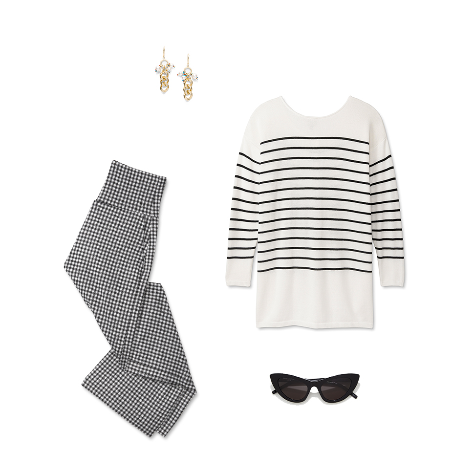 Now, button up the cardigan and wear it backside-front for a pullover effect. The stripes with the checkered Bombshell Crop make for a dramatic effect.