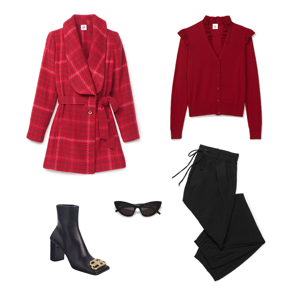 Black and red complement each other beautifully—always have, always will. Style the solid scarlet Cavalier Cardigan fully buttoned as a blouse, then layer on the red plaid Evita Coat for added dimension.