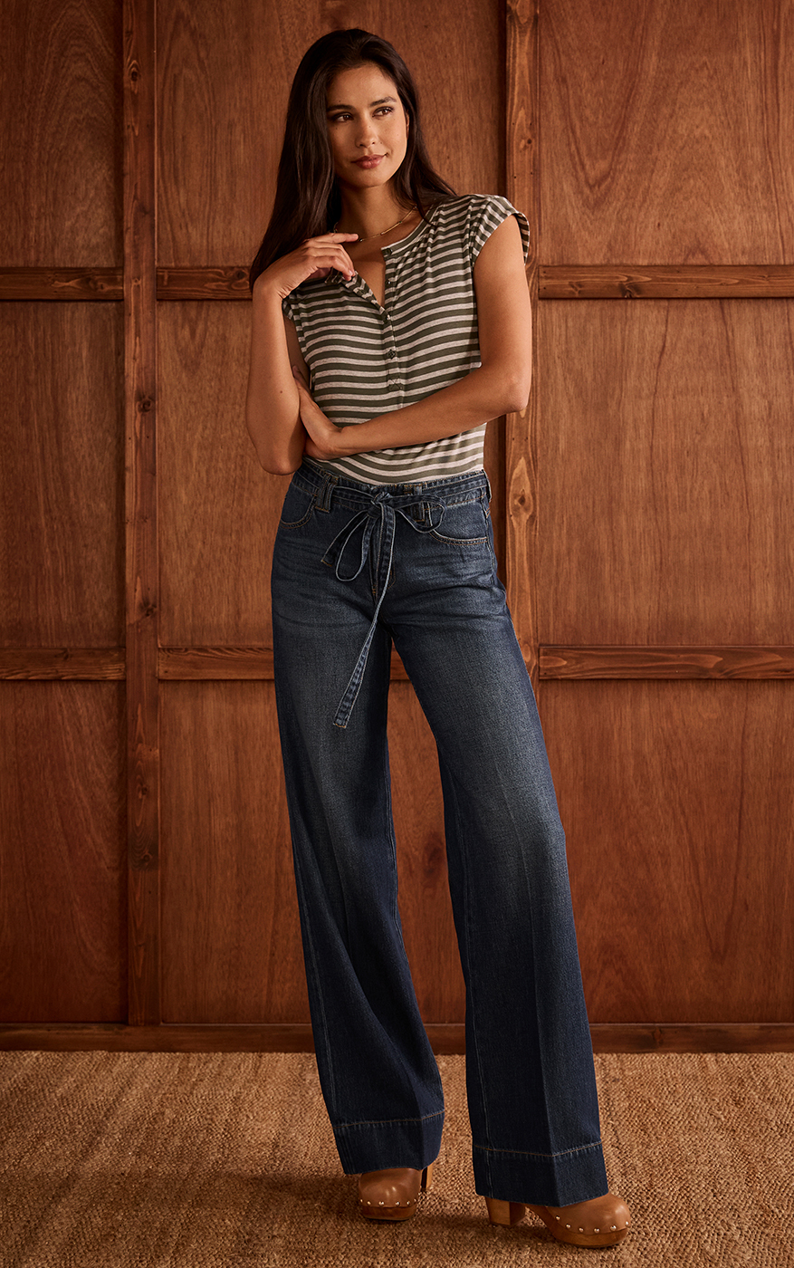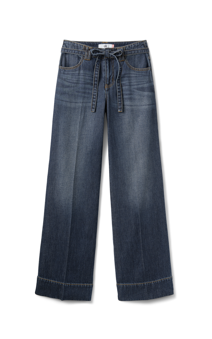• Easy fit, high rise, removable tie belt, zip fly, wide leg