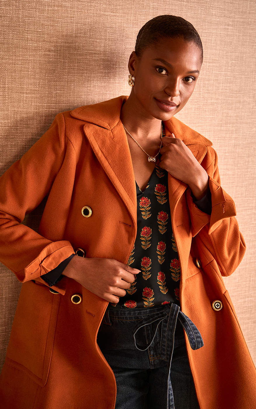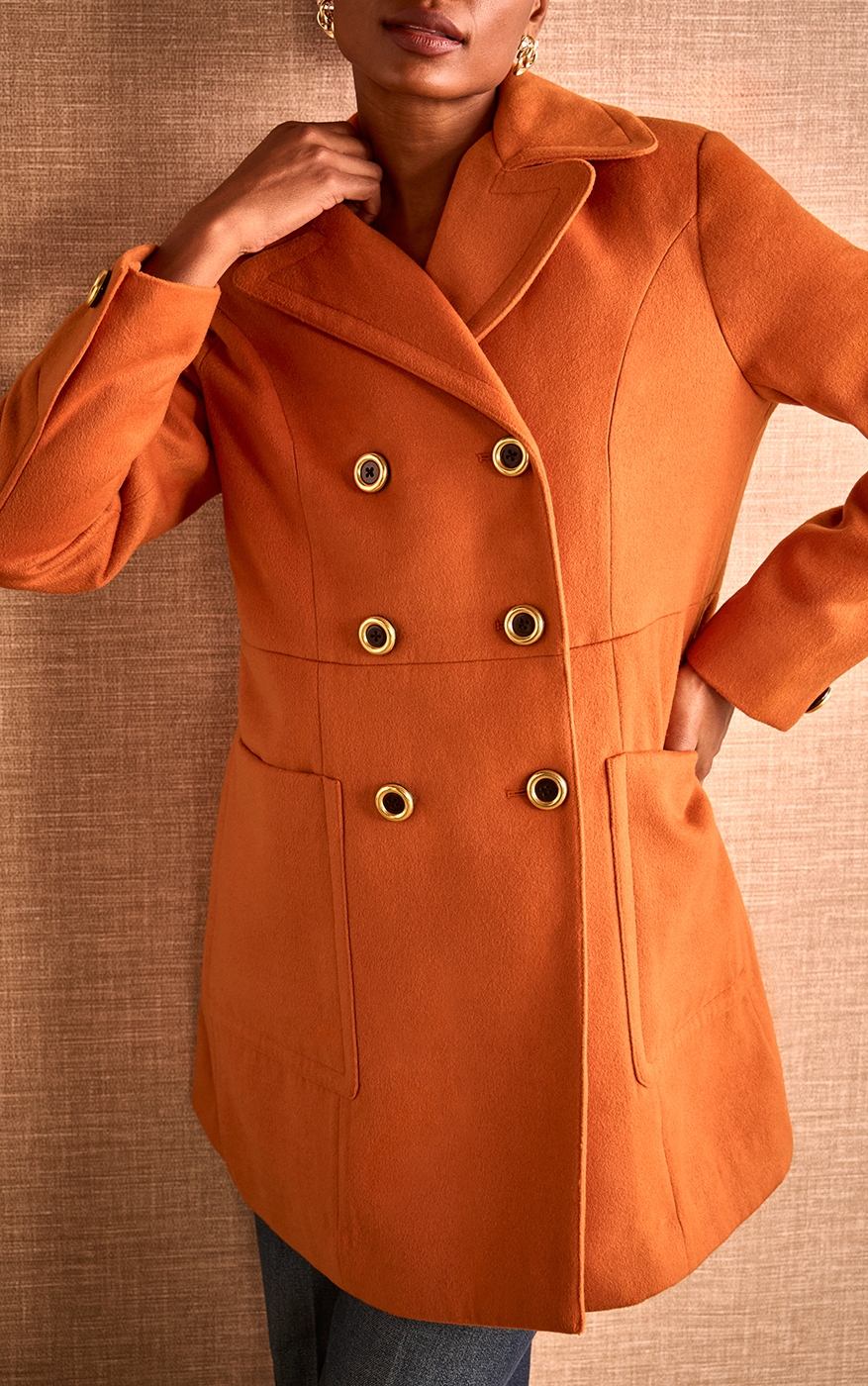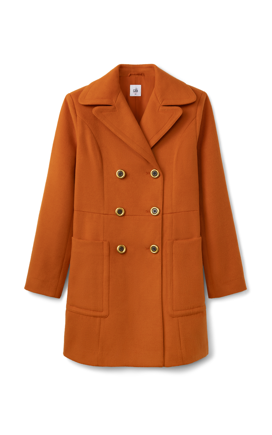 With the look of wool, minus the itch, the Camden Coat is a copper stunner with a cozy, brushed texture. Its slightly A-line shape, oversized notch collar, and tons of tailored touches make this a true classic with an autumn twist.
