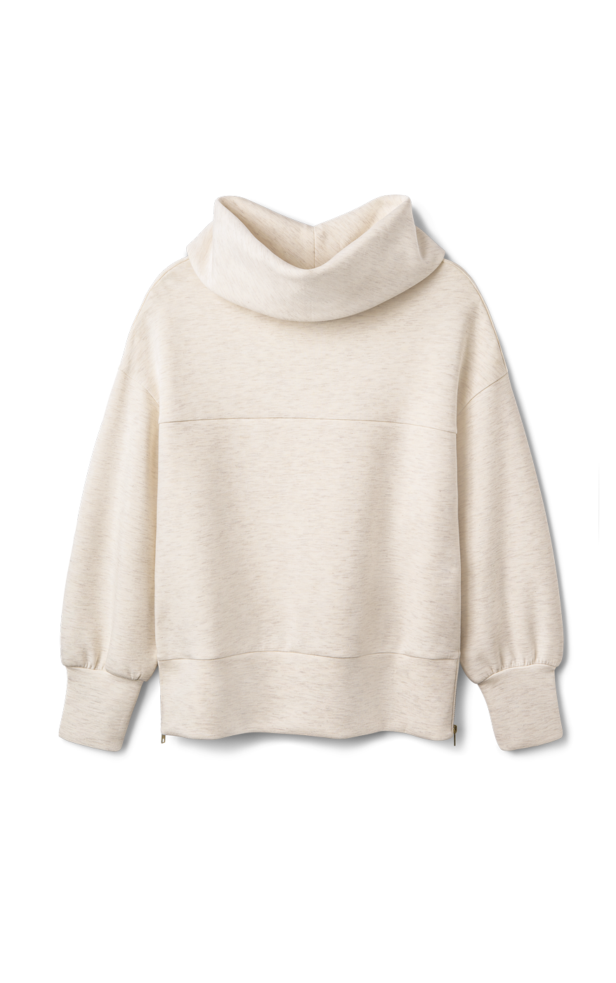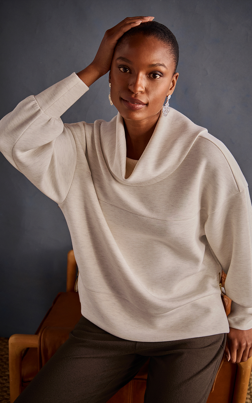 • Relaxed fit, cowl neckline with an oversized notch in back, dropped shoulders, front horizontal seam detail, long sleeves with wide cuffs, wide band at hem, side seam zippers
