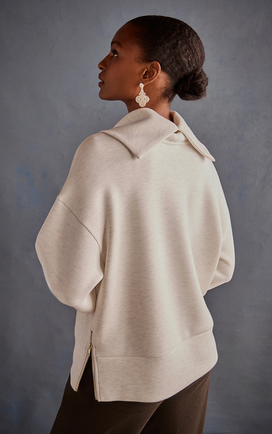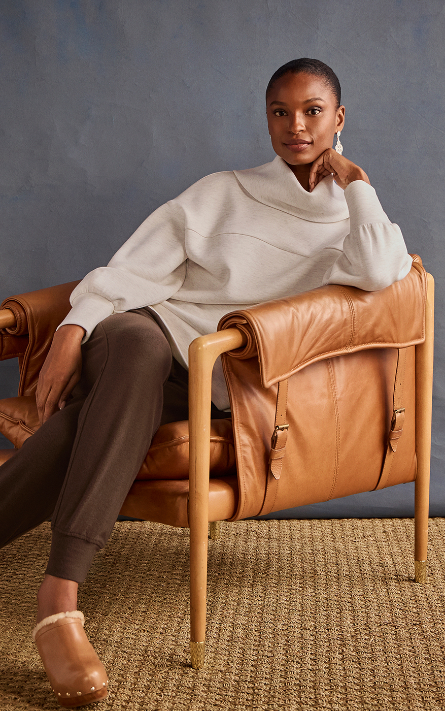If you want a look that’s as comfortable as it is distinctive, reach for the Eden Cowl Neck Top. Its lofty, lightweight fabric, side seam zippers, and oversized silhouette pair perfectly with cords, jeans, or joggers—ideal for laid-back weekends or running around town in plush and polished style.