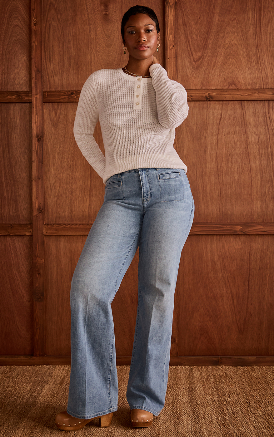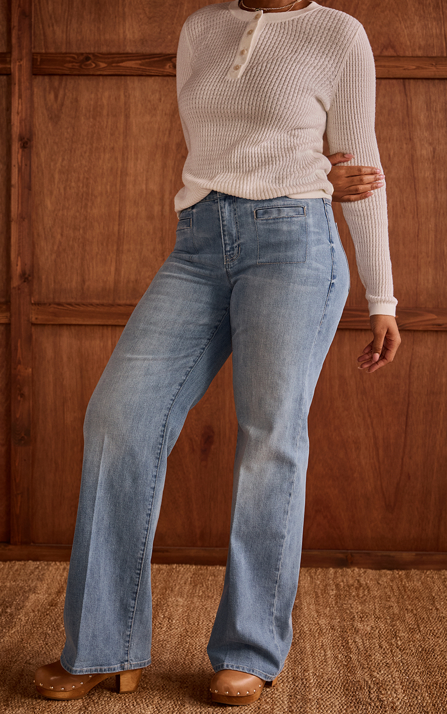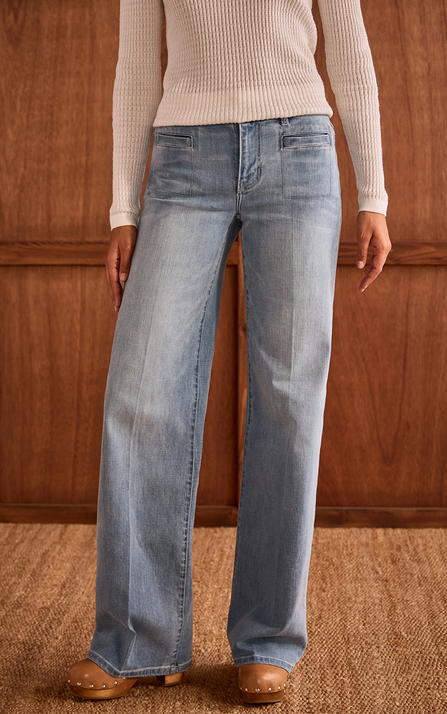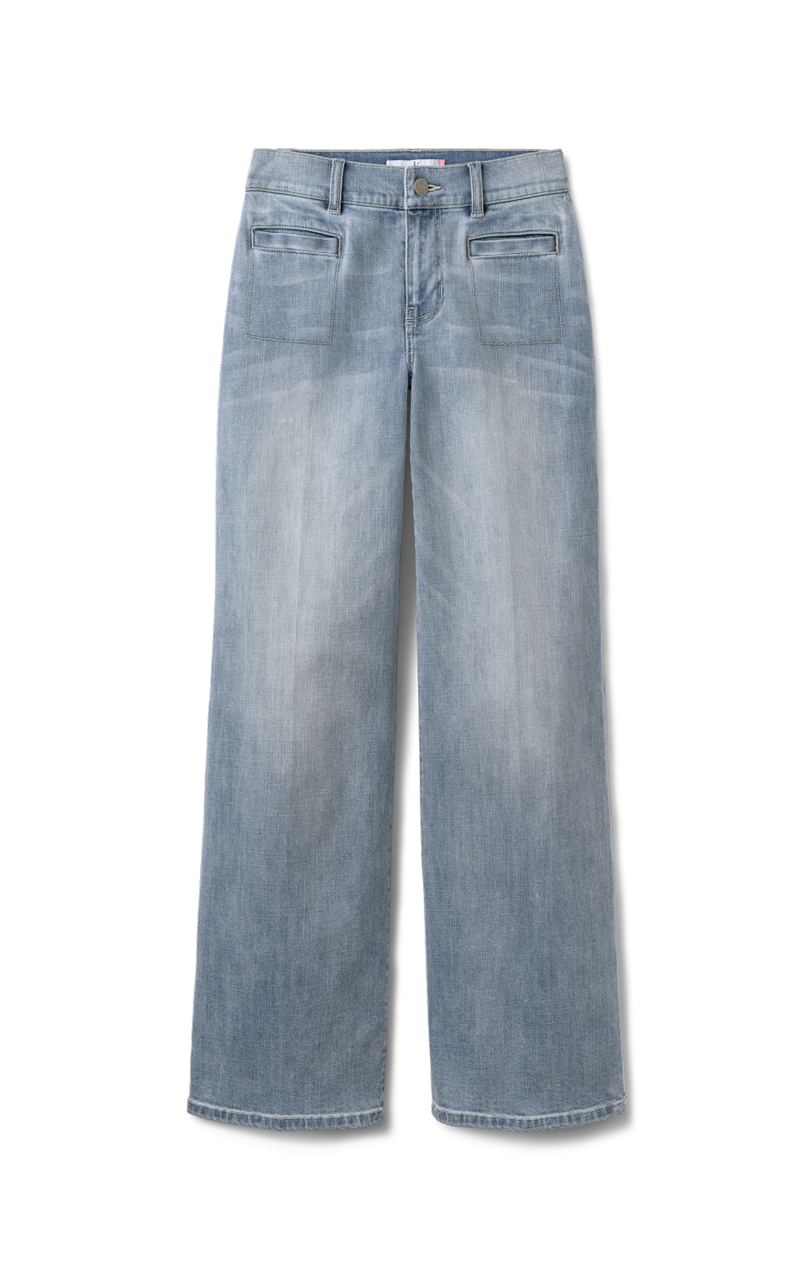 - Slim fit, high rise, wide leg, front welt hip pockets with topstitching, back patch pockets