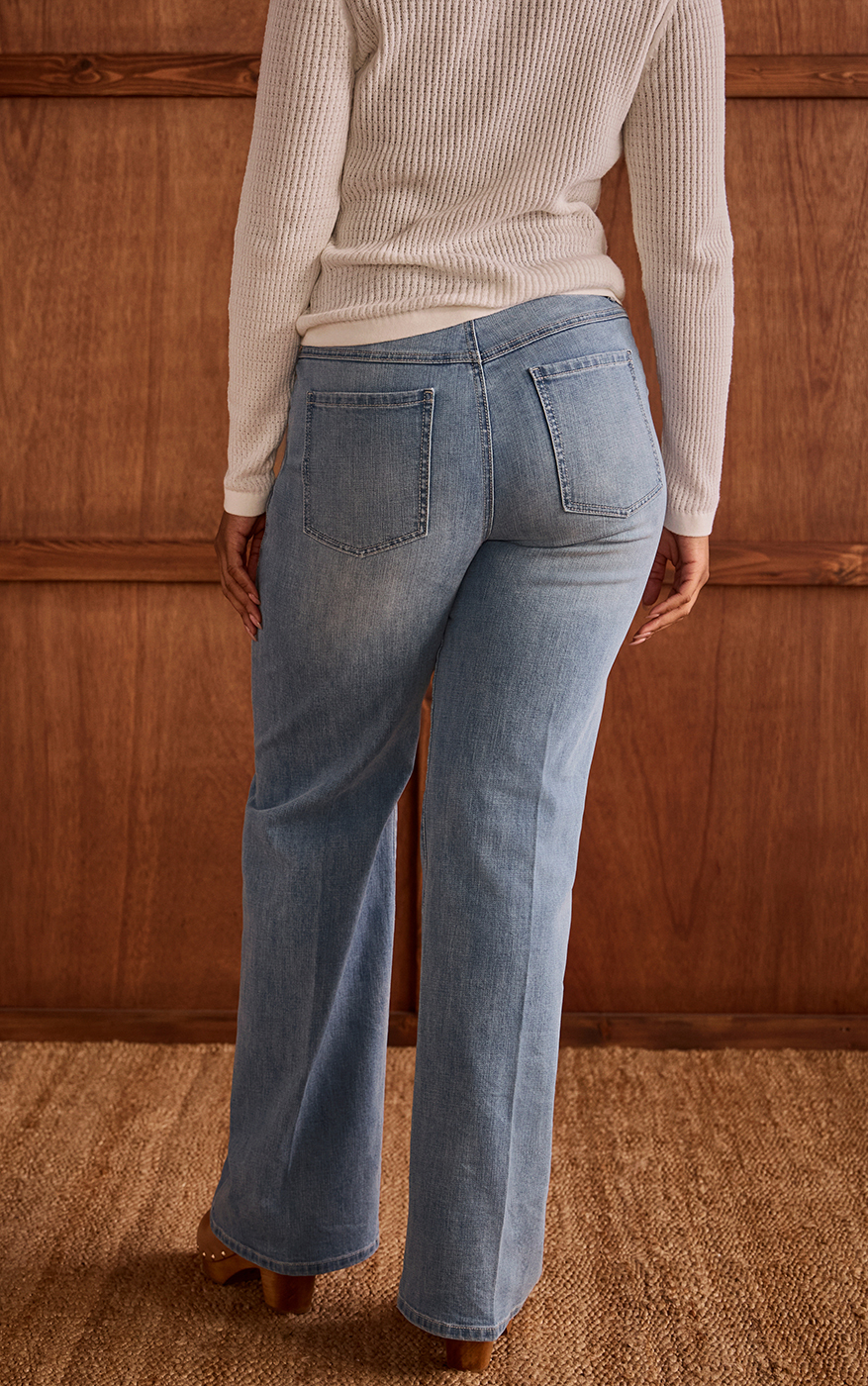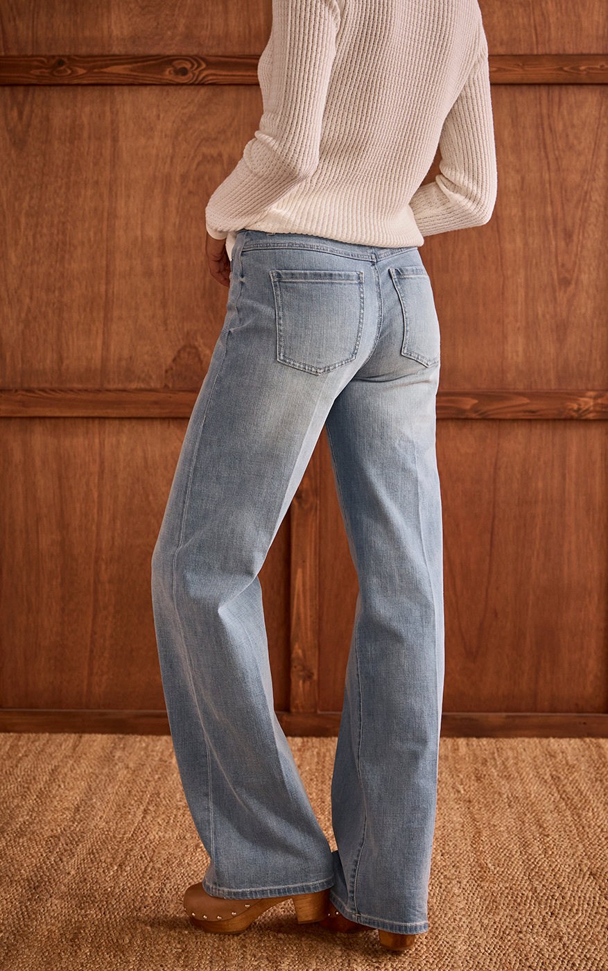 The Venice Jean is a sun-bleached beauty with the same silhouette as the dark wash Fall '24 Venice Trouser Jean with an on-trend light wash. Its leg-lengthening style is a standout choice for fall, perfect for brunch, gallery visits, or city strolls.